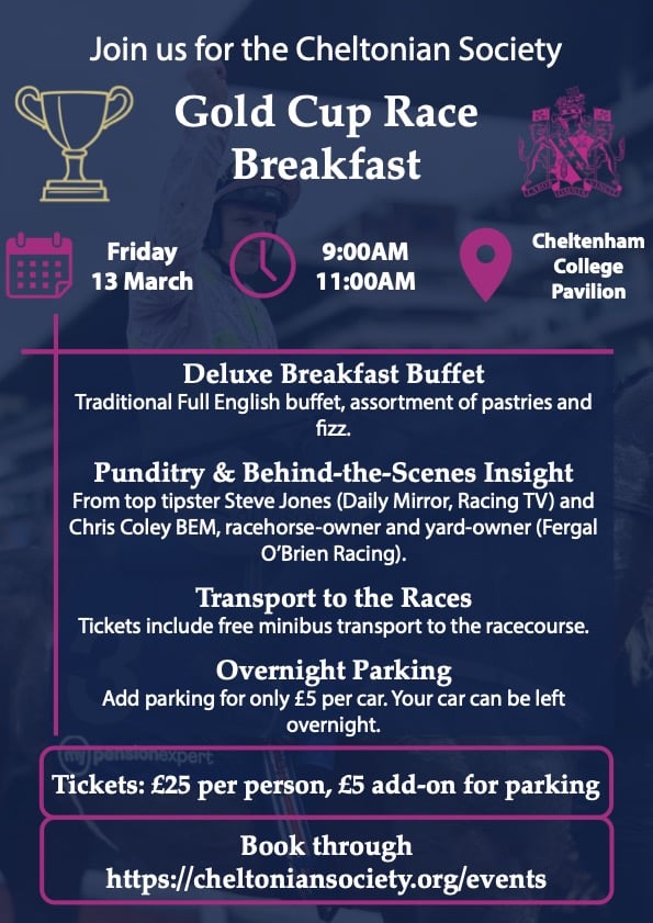 Cheltenham College is pleased to announce the Cheltonian Society Gold Cup Race Breakfast, taking place on Friday 13 March 2026 from 9.00–11.00am in the Cheltenham College Pavilion.